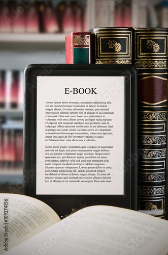 © Proxima Studio, Obraz premium E-book reader device on desk in library