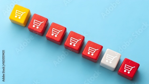 © Ramani, Obraz premium E-Commerce Flow – Diagonal Line of Shopping Cart Keyboard Keys, Business, Conceptual, Strategy, Motivation, Abstract, Light Blue Background