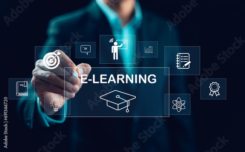 © Bussarin, Fototapeta premium E-learning program certificate and online education learning workshop training.Male and female students icons virtual screen and Video lesson online classes on the internet.