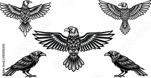 Obraz premium Eagle and raven illustration set with detailed wings, flying and standing poses, bold bird artwork for tattoo design, logo, mascot, and decoration projects