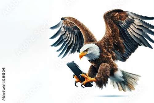 Obraz premium eagle flies with a smartphone in paws Isolated on white background