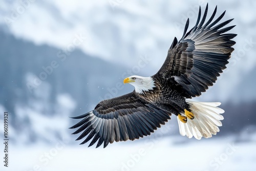 © Pachita, Obraz premium Eagle in Flight A majestic eagle soaring through the sky, its powerful wings flapping slowly, each feather visible as it glides effortlessly on the wind