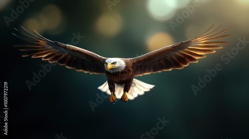 © Phirakhup, Naklejka premium Eagle in flight, majestic wings spread wide against a blurred green background.