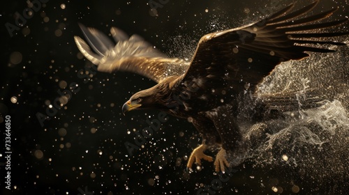 Obraz premium Eagle in flight with dynamic water splash on dark background