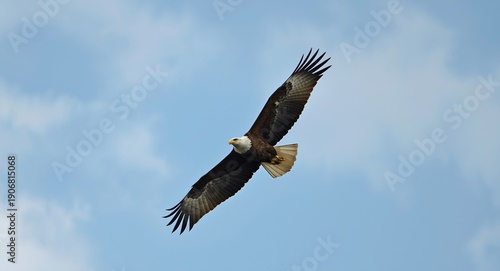 Fototapeta premium Eagle in majestic ascent through tranquil sky with delicate clouds emphasizing birdwatching joy