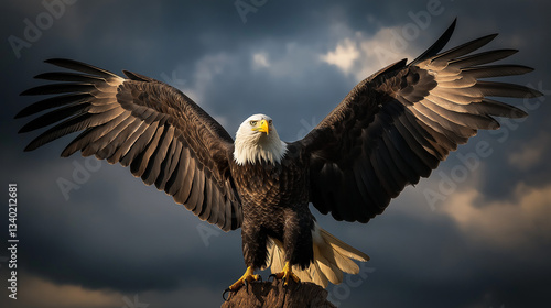 © Narayana, Fototapeta premium eagle landing moment with a dark cloud background.