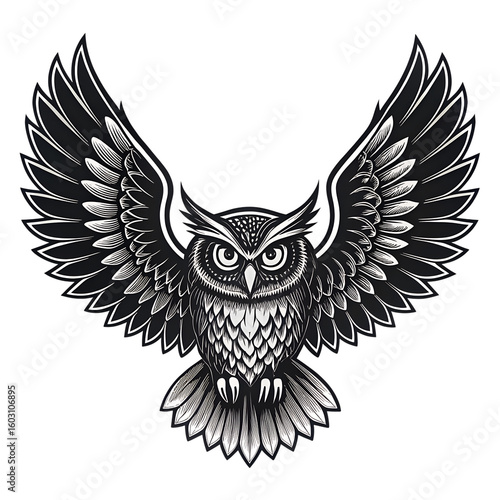 Obraz premium eagle owl vector illustration , Majestic Black and White Owl in Flight Illustration