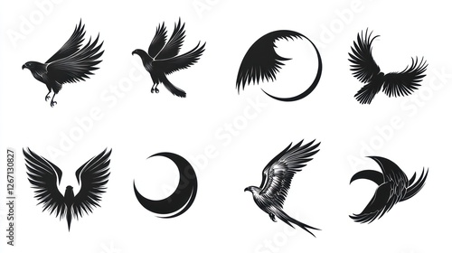 © Mufarokah, Obraz premium Eagle silhouettes, various poses, flight, white background, design elements