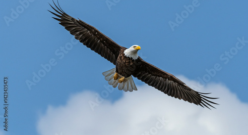 © Vanier Johanne, Fototapeta premium Eagle Soaring Across Clear Blue Sky With White Clouds