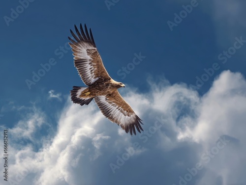 © riyad, Obraz premium Eagle Soaring High with Wings Spread, Amidst Clear Blue Sky and Fluffy Clouds