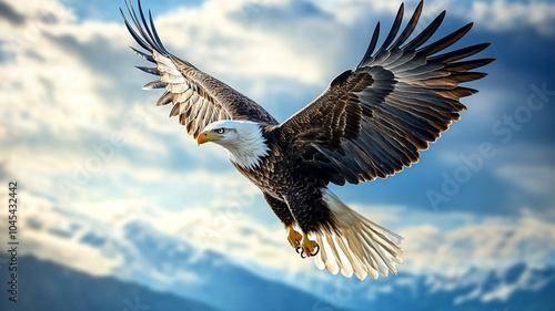 © BoszyArtis, Fototapeta premium Eagle soaring through a bright blue sky, wings fully spread, with ample open sky for copy space.