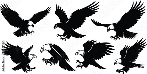Obraz premium eagle vector illustration Majestic Eagle Silhouettes - Powerful Bald Eagle Vector Set Dynamic Flying Eagle Graphics - Wildlife Bird of Prey Illustrations Aggressive Eagle Poses