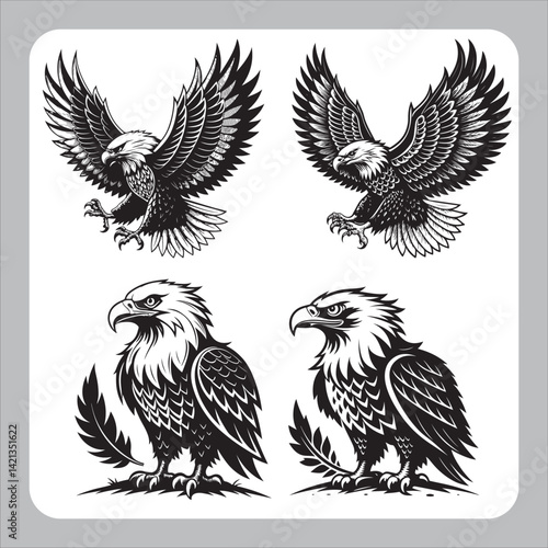 Obraz premium Eagle vector illustration set featuring cartoon and symbolic eagle designs in black and white