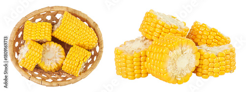 Obraz premium ear of corn in a wicker basket isolated on a white background. Top view. Flat...