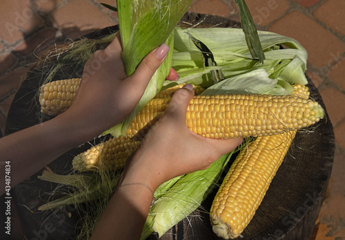 © Anna, Obraz premium ear of corn in female hands. Girl peels corn after harvest