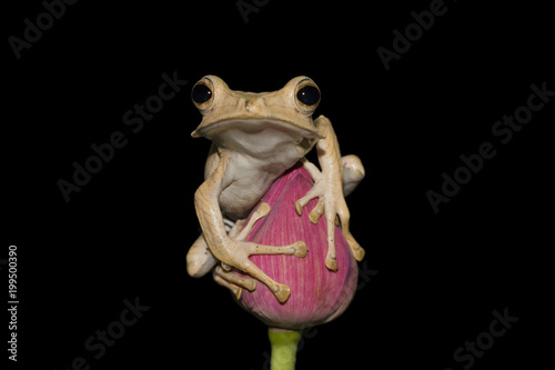 © kuritafsheen, Fototapeta premium Eared frog sitting on bud with black background, frog, animal, tree frog
