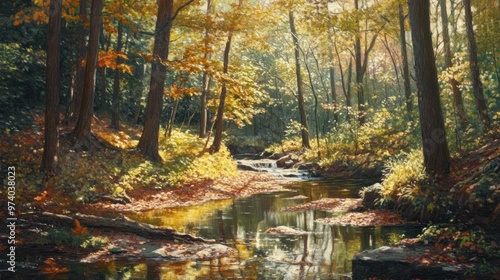 © sirisakboakaew, Obraz premium Early autumn scenery, capturing the first signs of fall with a blend of green and turning leaves, a gentle stream, and soft sunlight filtering through the trees