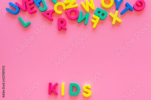 Fototapeta premium Early childhood development concept. Word kids written by plastic letters of toy alphabet on pink background top view copy space