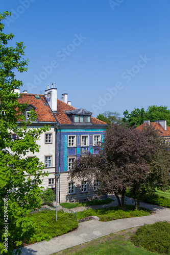 Fototapeta premium Early color houses surrounded by green trees. Warsaw