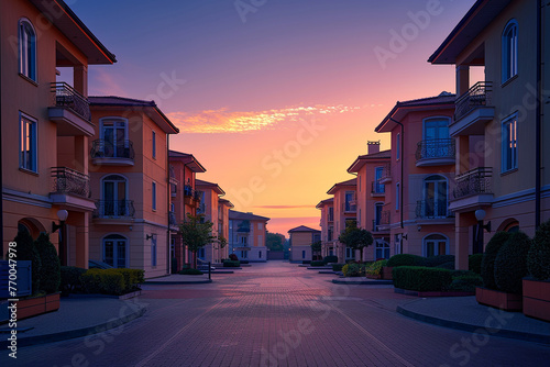 Fototapeta premium Early dawn perspective of European apartment complex, serene beauty of...