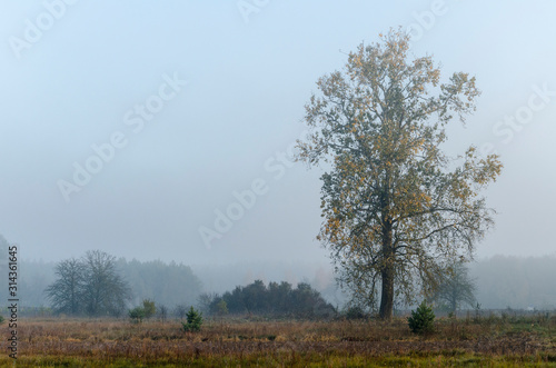 Fototapeta premium early morning autumn landscape, lonely birch in the fog