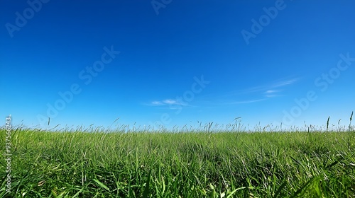 Obraz premium Early morning blue sky over lush green meadow with vast open space