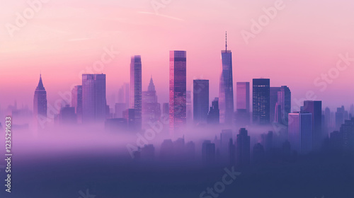 Fototapeta premium Early Morning City Skyline Revealing Skyscrapers and Mist With a Soft Purple...