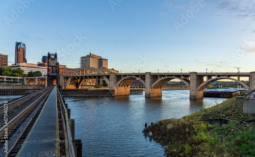 Naklejka premium Early morning cityscape of St Paul and Twin Cities in Minnesota and Mississippi river with railroad bridge