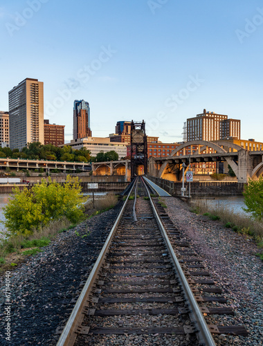 Naklejka premium Early morning cityscape of St Paul and Twin Cities in Minnesota looking down rails of railroad bridge
