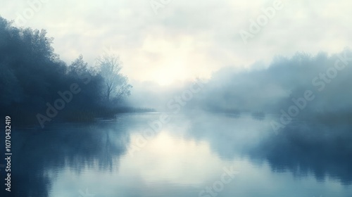 Fototapeta premium Early morning fog drifting over a tranquil river, with soft light peeking through the mist