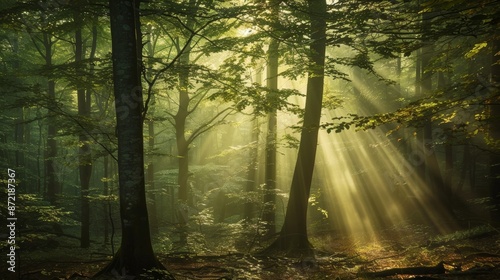 Naklejka premium Early morning forest with dense fog, sunlight filtering through, creating a...
