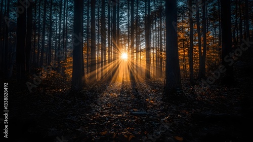© BAYC, Fototapeta premium early morning in the forest, the sun has just risen, a ray of sunlight shines directly from the front