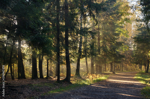 Fototapeta premium Early morning in the spruce forest with a hiking path lit by the sun