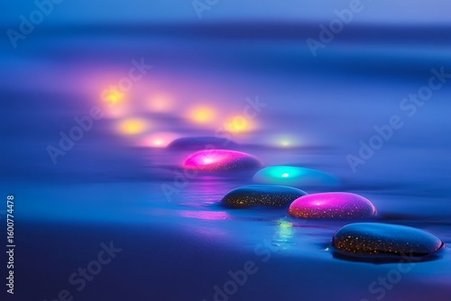 Obraz premium Early morning mist covering glowing colorful pebbles on a serene beach with...
