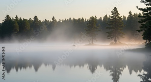Fototapeta premium Early morning mist hangs over a serene lake with reflections of the trees and...