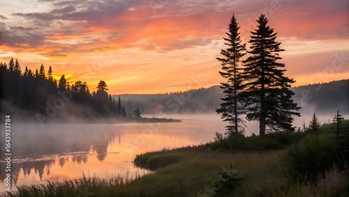 © PixelNest, Naklejka premium Early morning mist hovers above a peaceful lake, reflecting the stunning orange and yellow sunrise sky, framed by dark evergreen forest trees.