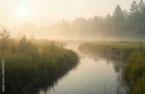© Vadym, Fototapeta premium Early morning mist over flooded meadow in Oulanka National Park Finland. Calm water reflects sky, trees, fog. Idyllic wilderness scene, fresh air, natural beauty. Inspiring landscape in Northern
