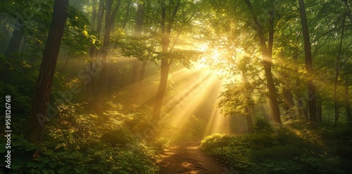 Obraz premium Early morning misty forest Low Angle Shot vibrant greenery Sepia tones