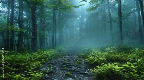 Fototapeta premium Early morning misty forest woods. Generative AI.