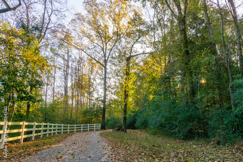 Naklejka premium Early morning sun dapples trees along a walking trail.