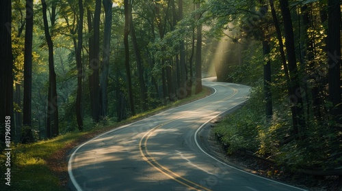 Obraz premium Early morning sun shines on curvy asphalt road through dense woods