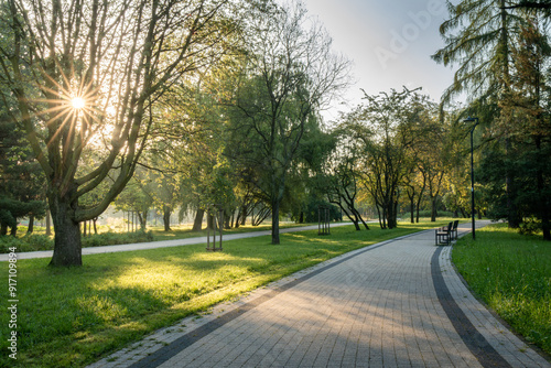 © Lukasz Czajkowski, Obraz premium Early morning sunlight filters through trees in a public park with a winding pathway