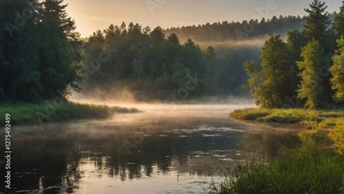 Fototapeta premium Early morning sunlight illuminates the misty river and rolling hills covered with forest.