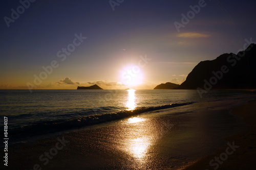 © Eric BVD, Naklejka premium Early Morning Sunrise on Waimanalo Beach over Rock Island bursti
