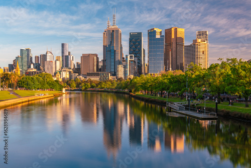 © Stefan Mokrzecki, Naklejka premium Early morning view of the city high rise buildings in Melbourne, Victoria, Australia are reflected in the calm water of the Yarra River.