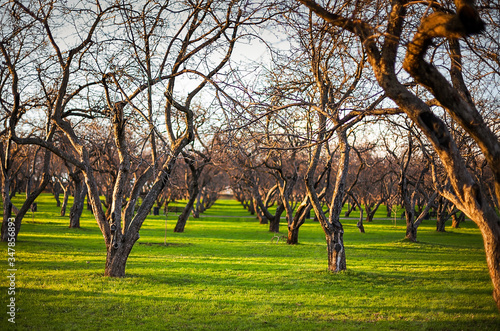 © Maria, Obraz premium Early spring apple trees planted in rows in Kolomenskoye public park, Moscow