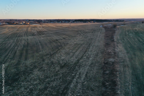 Naklejka premium early spring field top view drone, abstract landscape flight