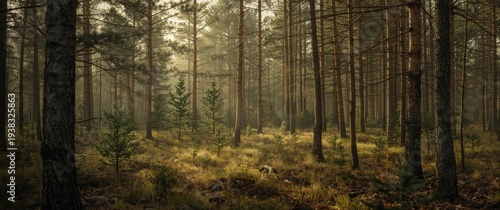 © NFTNexus, Fototapeta premium Early spring forest with young conifer trees and soft light