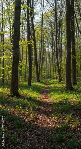 Obraz premium Early spring light filters through a quiet forest, illuminating bare trees and awakening undergrowth. A peaceful natural transition scene ,seasonal ,awakening ,serene