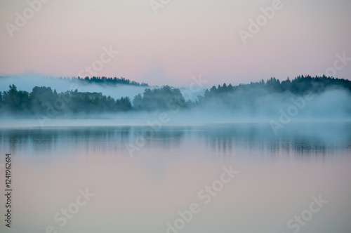 Fototapeta premium Early summer night by a calm lake in Finland with fog rising from the water